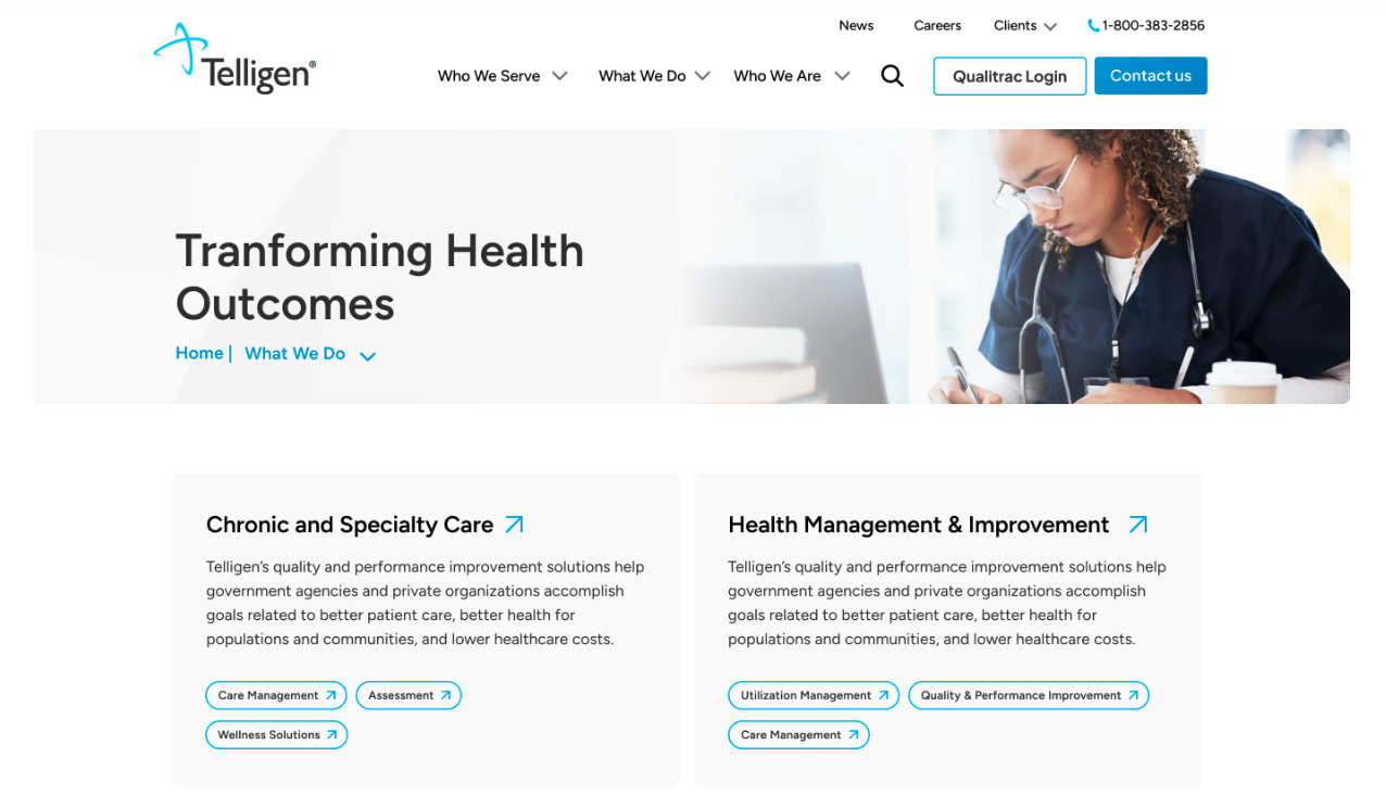 Telligen works with Federal, state and private employers to optimize their healthcare programs to be more efficient. Their goal is to improve health outcomes for individuals and to organizations time, money and resources. The main users would be managers at government or company offices looking to work with Telligen to audit their healthcare programs.